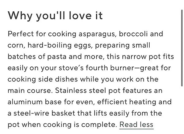 Perfect for cooking asparagus, broccoli and corn, hard-boiling eggs, preparing small batches of pasta and more, this narrow pot fits easily on your stove’s fourth burner—great for cooking side dishes while you work on the main course. Stainless steel pot features an aluminum base for even, efficient heating and a steel-wire basket that lifts easily from the pot when cooking is complete…$50 FIRM