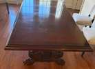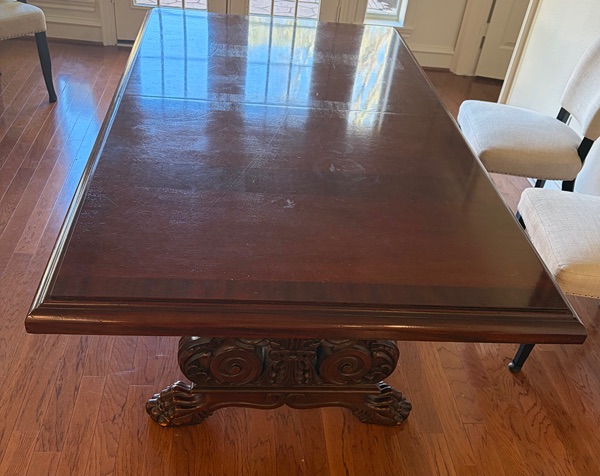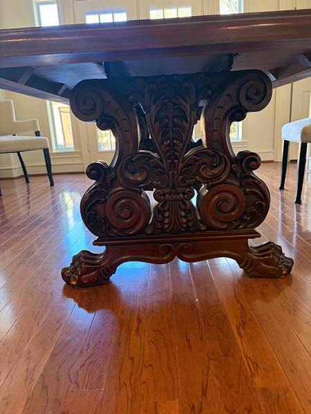 Beautiful mahogany wood table with carved fleur de lis pedestal inlay and claw legs. There is also an 18 inch expansion leaf in perfect condition. The table top has surface scratches.