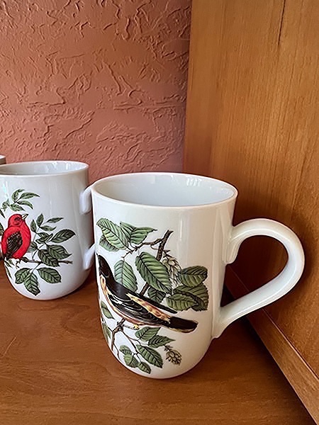 Featuring birds and flowers. Each measures approx. 4" high, 4" rim to handle, 2 3/4"diameter at mouth.