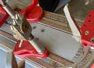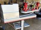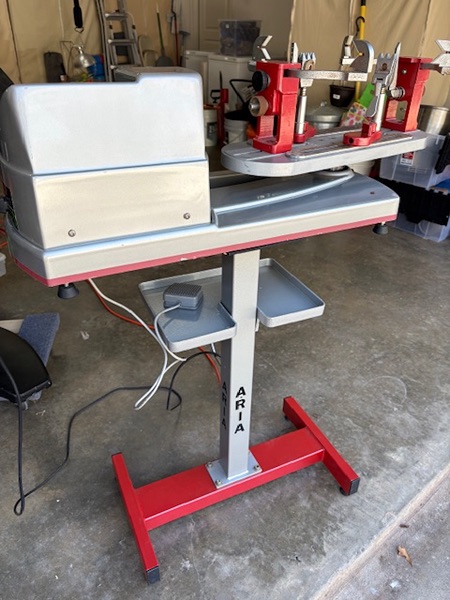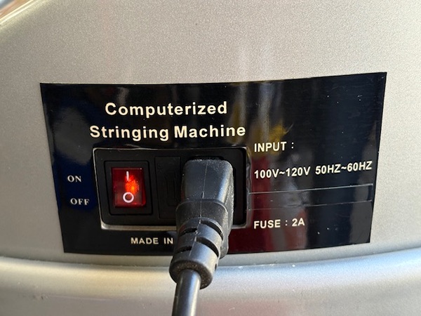 This stringing machine is used and in fair condition and also throwing an “alarm 04” for gripper obstruction. The body shows no wear but does have some surface rust on some of the metal parts. But gravity clamp bases and channels move smoothly. All main components are intact (i.e., arms, clamps, foot pedal, power cord) and electronic screen and buttons are in very good condition.