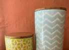 Green and blue geometric patterned ceramic canisters with bamboo lids