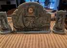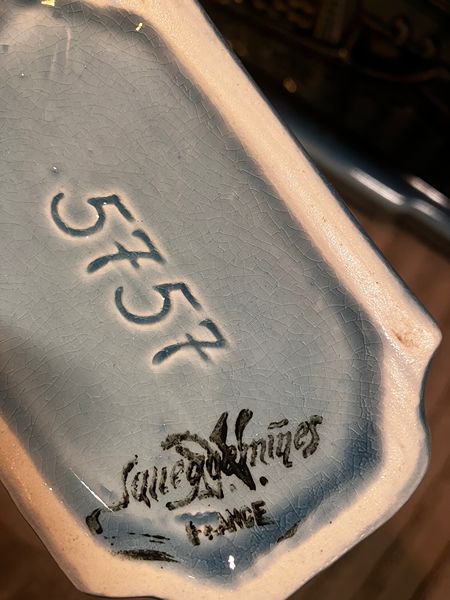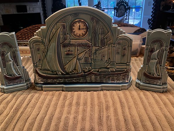 Beautiful vintage Majolica Sarreguemines clock set, depicting a European port scene with sail boats and schooners. The set is in perfect condition and is running great. Clock is 14 1/2" W and 11" T, garnitures are 8 1/2"T and 4"W.