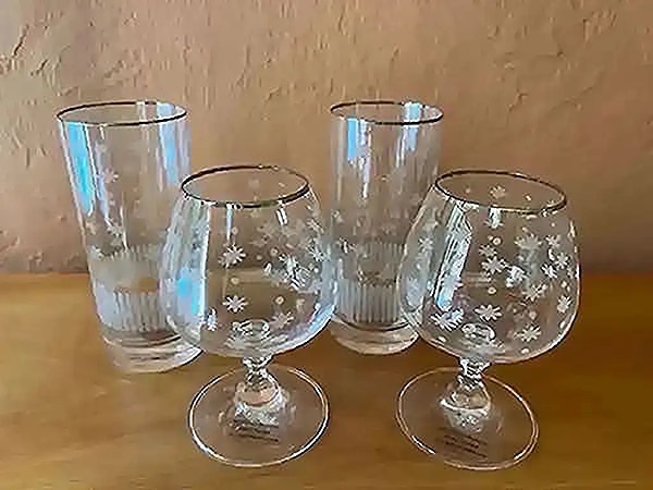 Mid century modern vibe! All are new, Etoile (starburst) etched glass with real platinum trim. Made in Slovakia. Two highball glasses (5.75”x 2 1/2”) and two brandy glasses (5” x 3 1/2”)…$40 total - willing to separate