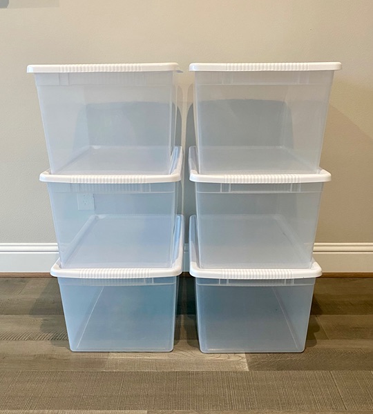Rugged, stackable, clear plastic containers with white lids.