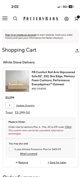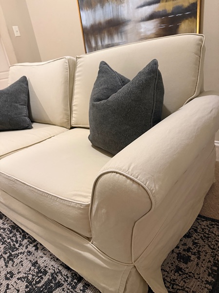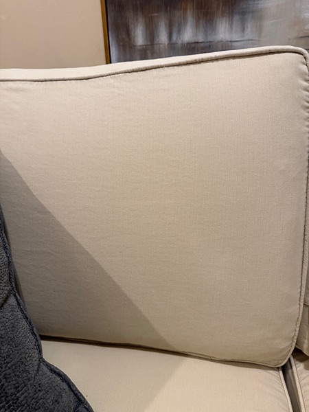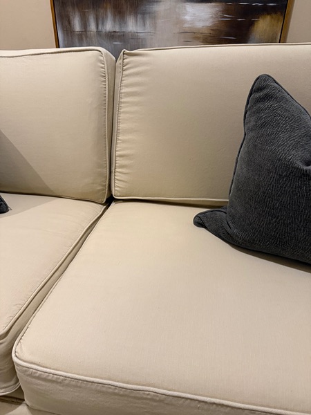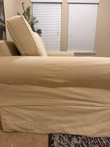 Beautiful PB slipcovered sofa-this is the Cameron collection.It’s in a fantastic condition. Slipcover slips off easily for a good wash. There is no rips or stain & no signs of wear. Back cushions are extra firm. Bottom cushion are soft. It is deep seating & it does Velcro on the sides to give it that tucked in look. Performance fabric.