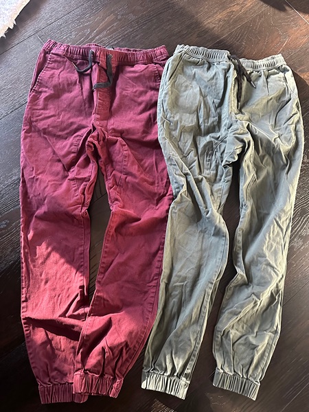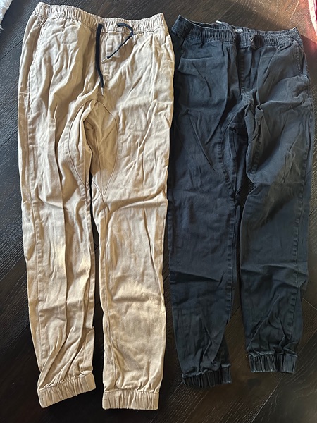 5 pair of men's Zanerobe brand joggers. Size 34 waist. Very nice quality, heavy cotton fabric. Only slightly worn and in excellent condition! The colors are dark burgundy, navy, khaki, olive green, and camo. I paid $130 for each pair. Selling them for $25 a pair. Located in The Woodlands.