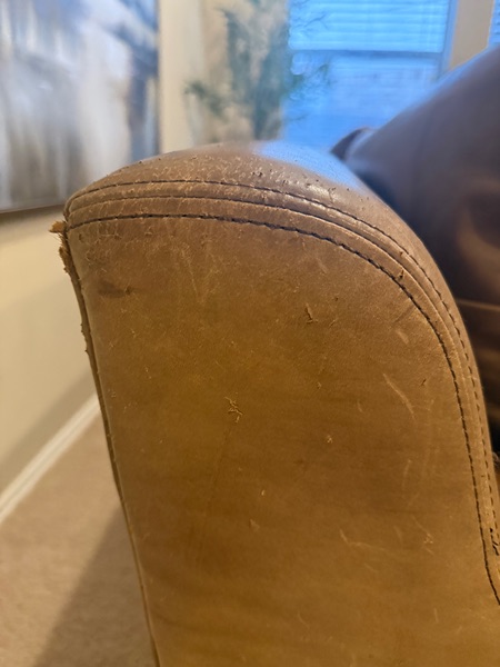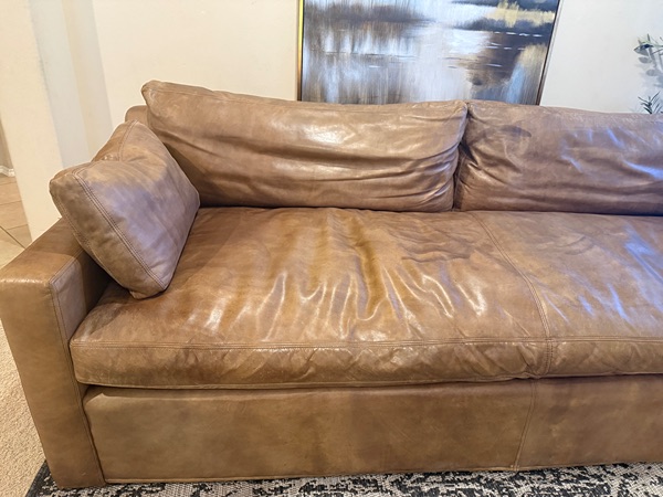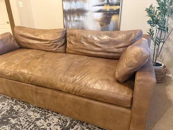 Gorgeous RH Cloud Sofa- this is the Belgian Collection. No longer selling it online. This color is a selling point. Down feather cushions. It’s extremely comfortable. There’s some cat scratches on the back corner (see pic). Other than that, it’s in great shape. Bones are strong and sturdy. Genuine real leather. Minor signs of wear. Amazing quality that will last.