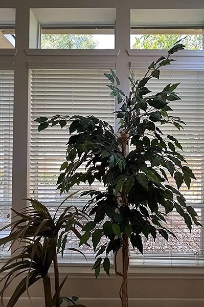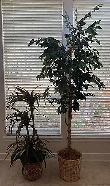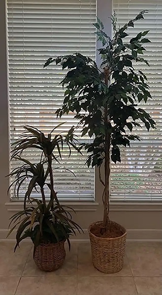 Two artificial plants in wicker baskets. Tallest one (7’+) has little bird in nest and the shorter one is about 4’ tall…$50, total, firm