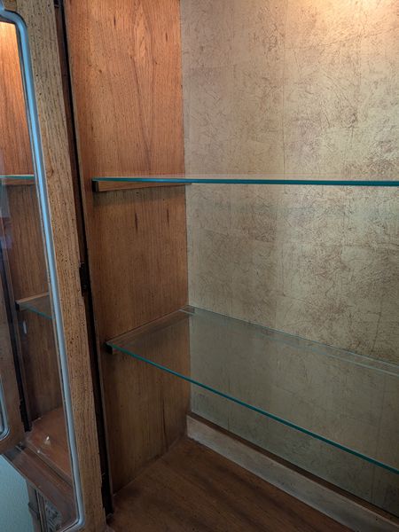 It comes in two pieces, the hutch and the base. The 4 doors have glass fronts and glass shelves inside. There are 3 lights above the shelves. The base below has 2 outside cabinets with shelves inside. There are 3 drawers in the center, and the top one is lined with red felt for silverware.