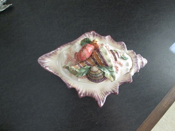 Sauce Boat- this piece is adorned with pearlized seashells and corals of different colors. it measures 6: wide, 3 1/2' from top to bottom and is a little over 4' tall. It said it was a sauce boat when I bought it, but I have never used it for anything other than decorative purposes.
