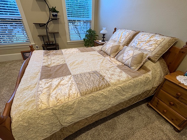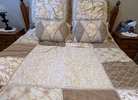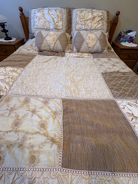 Elegant Queen comforter with intricate patterns. Two matching pillow shams and 2 matching lumbar pillows included.