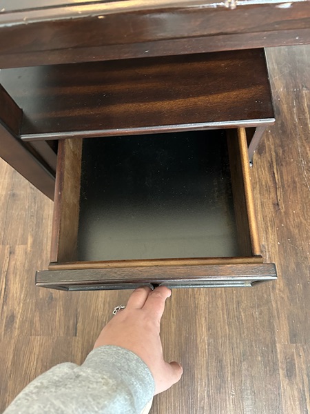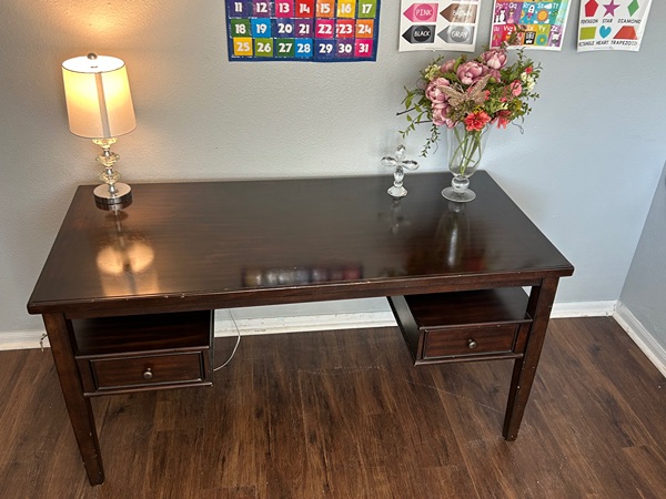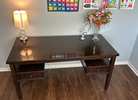 Solid wood desk! Is heavy so you will need help when picking up! Fully fictional drawers! Measurements are length 60 inches width 28 height 30