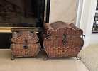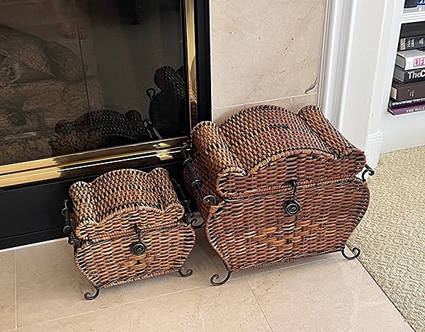 Two wicker baskets with decorative metal accents, perfect for storage or decor.