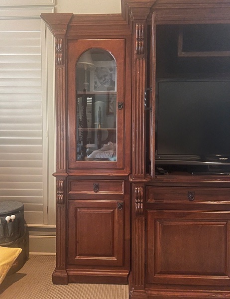 Beautiful three piece unit which is great for a media center, storage or display. Each section is solid wood with the side units having glass doors and shelving along with a cabinet and shelf below. The center piece is perfect for a television and other electronics with shelving and cabinets below. The pieces can be used together as one big unit or arranged to fit your space. Sturdy craftsmanship. 110' W x 85' H X 25' D (center units are 17' deep). Excellent condition. Cash payment. Buyer must pick up and help with loading.
