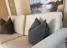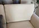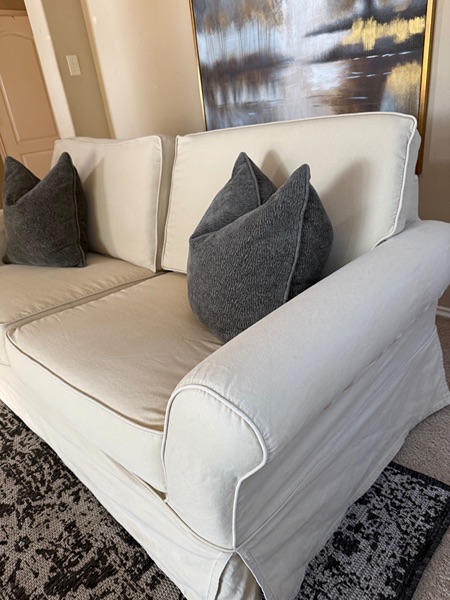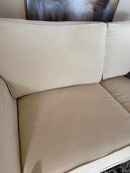 Beautiful PB slipcovered sofa-this is the Cameron collection.It’s in a fantastic condition. Slipcover slips off easily for a good wash. There is no rips or stain & no signs of wear. Back cushions are extra firm. Bottom cushion are soft. It is deep seating & it does Velcro on the sides to give it that tucked in look. Performance fabric in Ivory.