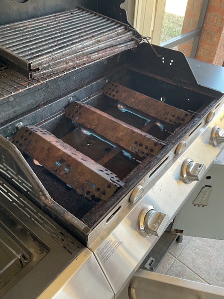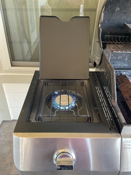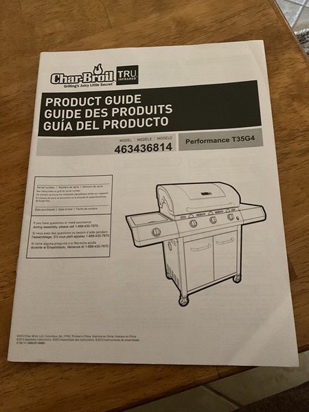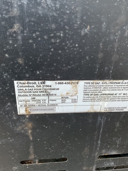 Char-Broil Performance Series 3-burner gas grill, featuring TRU-Infrared technology. It is powered by three main burners, generally totaling around 34,000 BTUs, plus a 10,000 BTU side burner for added versatility. Sturdy cabinet base with doors provides convenient enclosed storage for a propane tank and grilling tools. Cover for storage, original instruction manual and grill brush included. Electronic ignition for starting does not work, we have to use a hand torch. Overall condition is fair with some rusty parts, but it still works great. Propane tank is not included. These sell new for around $400.