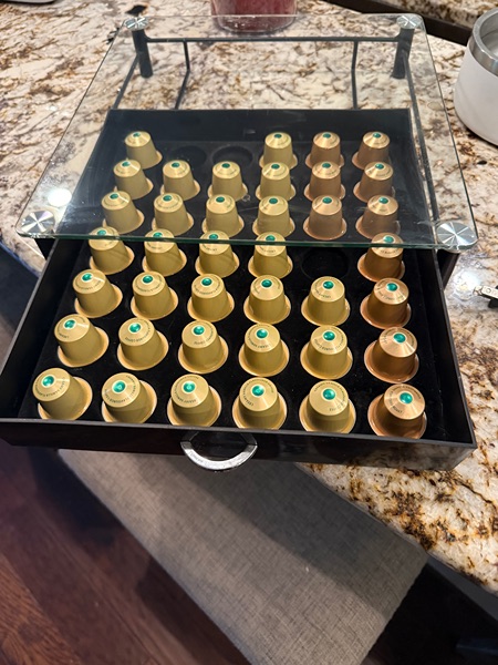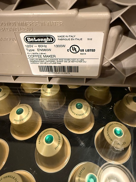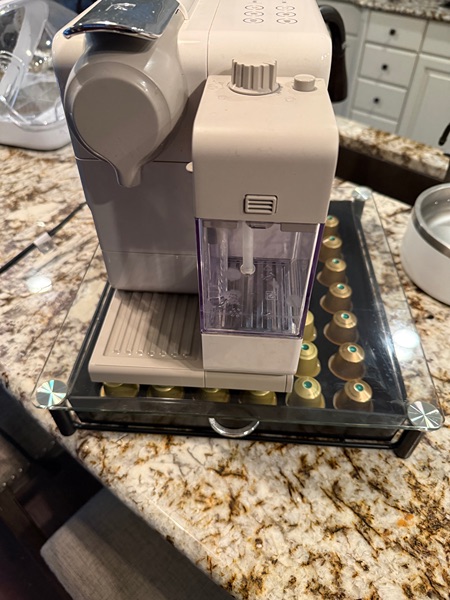 Makes Barista quality Expresso, Lattes and Cappuccino. Cleaned regularly and well taken care of. Unit comes with the glass pod stand .