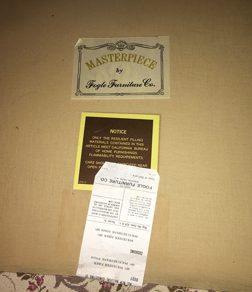 This Masterpiece sofa by Fogle Furniture Company is a vintage reproduction in a Victorian or French Provincial style. The sofa frame is an intricately carved mahogany wood. The custions and couch are polyester and polyurethane foam.