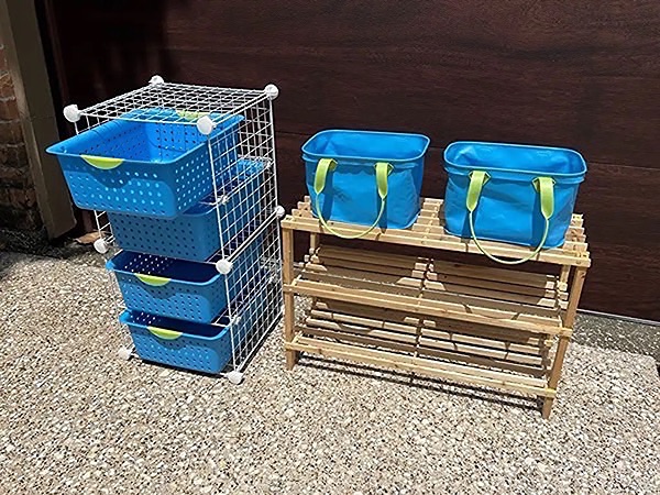 Includes a metal rack with blue baskets and a wooden shelf with blue bags…$50 firm
