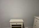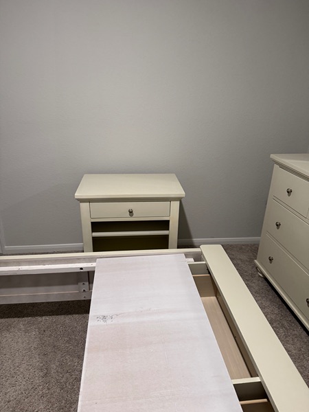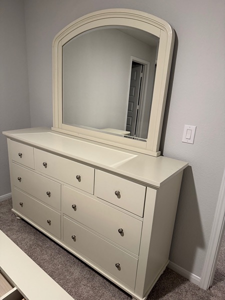 Large queen sleigh bed with storage, dresser with mirror, bedside dresser. Requires a 12x12 room or larger.