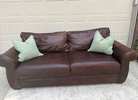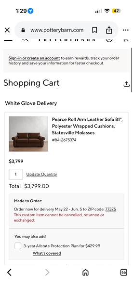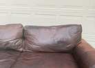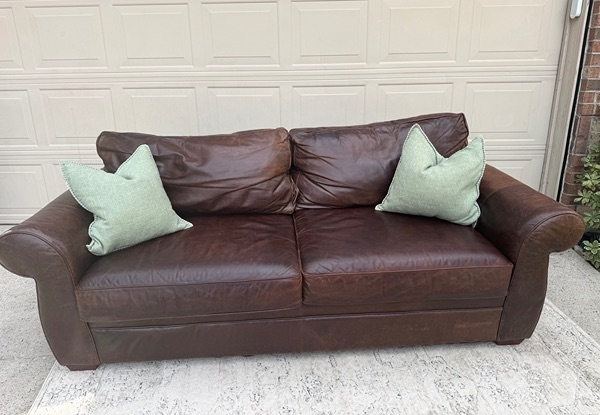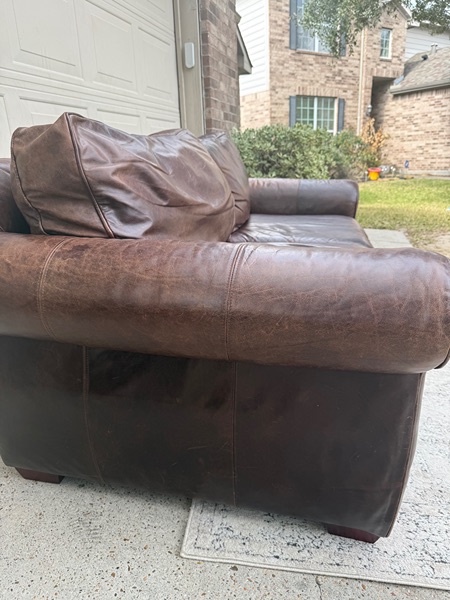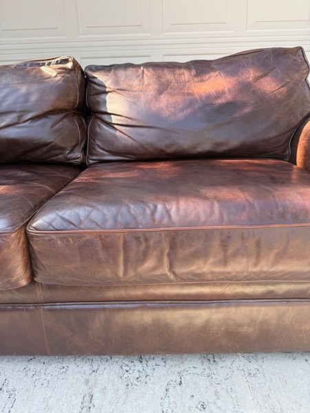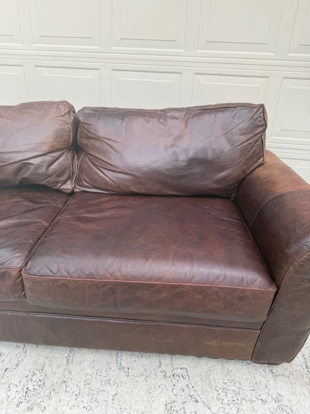 REAL leather sofa from PB - this is the Pearce Roll Arm Collection. In good condition. No rips or tears. Minor scratches. Signs of wear in some areas. Feather blended bottom cushions.