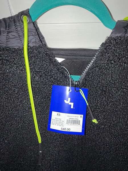 Brand is JoyLab, women's size XS with full-length zipper, long sleeves, side pockets and a quilt-like pattern on the hood and back panel. Lime green hoodie strings and drawstring tab at the waist. New with tags from smoke free home. $12