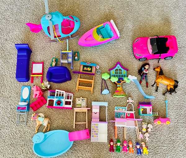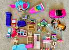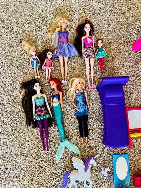 See both photos! Includes everything you see, plus the Barbie restaurant set, which folds up for easy storage. Everything is in good condition, except the pink car is missing a small side mirror. I don’t have all of the little accessory pieces for the sets, but these can be used with any accessories that you have. $50 for everything, porch pickup in The Woodlands.