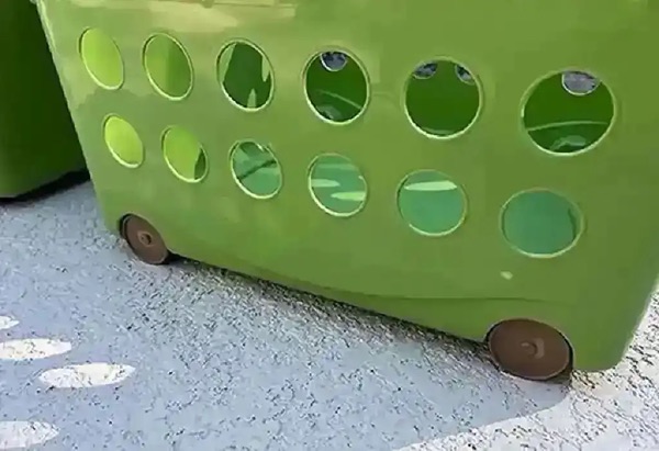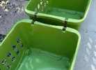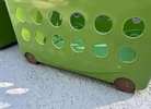 Sterlite Baskets on Wheels Green plastic laundry or storage baskets— stackable with wheels and handles. We used these under my son’s bunk bed to store costumes & toys. Each basket measures 25" x 16" x 11"