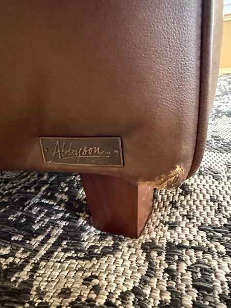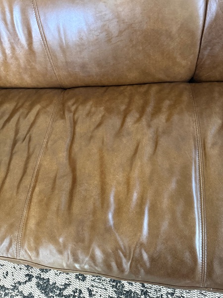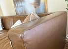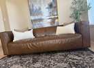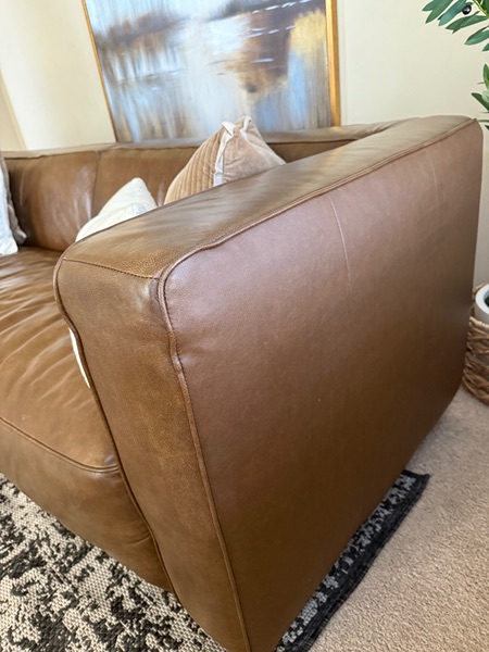 This sofa is SUPER comfortable. Long bench seating that fits up to 3 people comfortably. Color is “Dark Camel”- gives you that mid century vibes. Top Grain Leather and there’s minor signs of wear. Small rip on the bottom corner from transporting. Overall it’s in great shape!