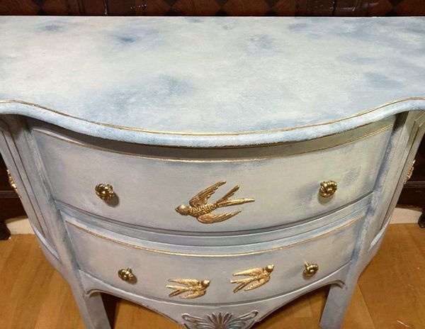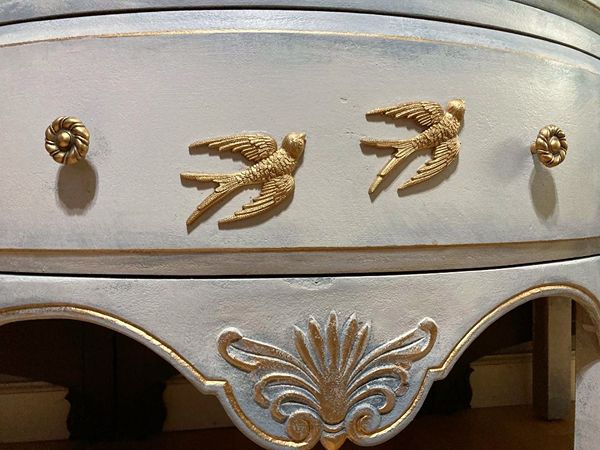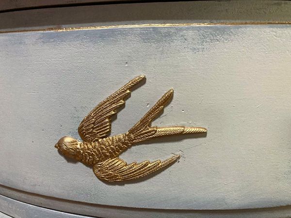 - We cleaned, filled, sanded, primed, added layers of creams and blues for a beautiful cloudy sky look. Then I applied hand poured moulds of birds, gilded and sealed for durability.