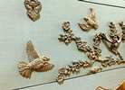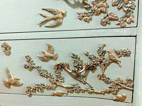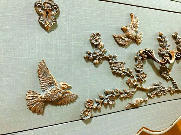 - We cleaned, filled, sanded, primed, added worn linen texture paint and glazed in layers, hand poured and applied moulds of birds and branches and florals, then, gilded and sealed for durability.
