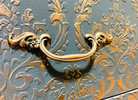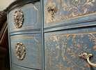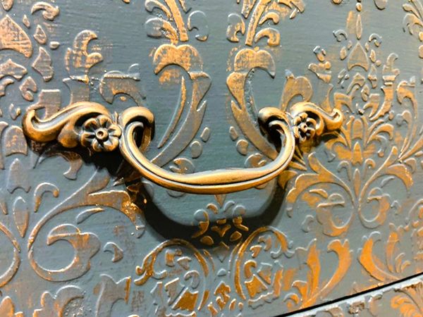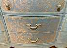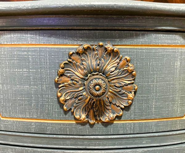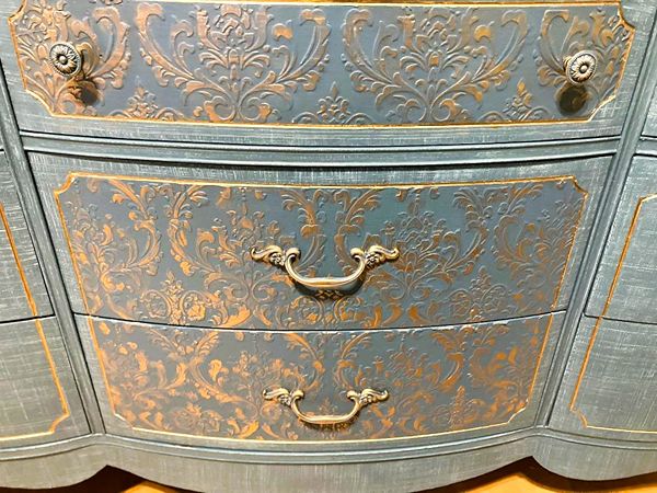 - Re-imagined, French country, 9 Drawer is ready for your home.- We cleaned, filled, sanded, primed, added worn linen texture paint and glazed in layers. We hand poured molds for backplates on the outer drawers and found some really pretty vintage handles for the front bottom drawers. Then we added raised stencil designn on the front and guilded it and used the same stencil for the sides unguilded, then sealed for durability.- I created the look of cozy worn denim with a painting technique. It's hard to see it in pictures but it is a very luxurious feel and look in person.- All drawers are sturdy and glide smoothly in and out.- Color is a lovely, worn denim blue.PLEASE TEXT