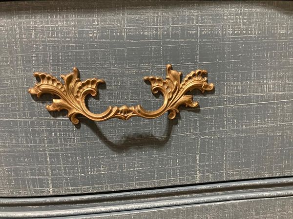 - We cleaned, filled, sanded, primed, added texture then muted blue glazes in layers, Hand poured moulds of magnolias then attached, finally we gilded and sealed for durability.