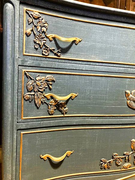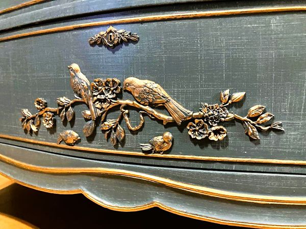 - We cleaned, filled, sanded, primed, added worn denim texture, applied hand poured moulds of birds and branches then painted in layers, gilded and sealed for durability.