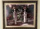 Large elegant framed painting of a garden scene with ornate border. Approx. 34” x 28”…discounted to $20 firm!