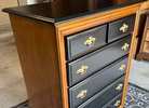 Elegant Gentleman chest of 6 drawers redesigned featuring a refined contrast of natural wood tones, deep black drawer fronts, and ornate brass hardware. This piece blends classic charm with a modern, elevated look—perfect for adding sophistication to any room. Dimensions Height: 47.5" Width: 36" Depth: 18". Thoughtfully updated to highlight its original character while giving it a fresh, contemporary presence. A timeless statement piece ready to enhance your home.