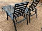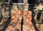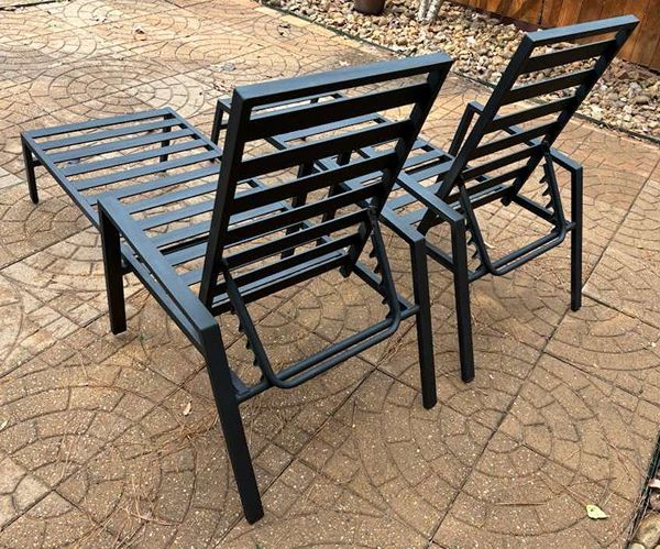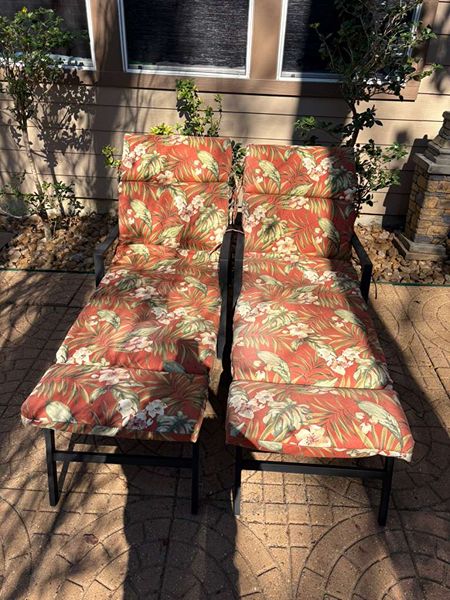 (Could Be sold separately) Set of 2 steel lounge chairs with cushons. 5-position adjustable backrests, in black. Briefly used, weight 31 Lbs each. dimensions: 76.75” long, 21” wide (25” including armrests), 12.5” to 20.75” high. NO rust or dents. Compare quality. Price for EACH icnlude cushion . Curbside delivery within The Woodlands area is available for an additional charge. ., 5 adjustable backrests