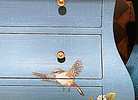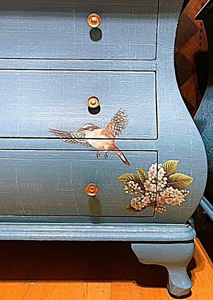 - We cleaned, filled, sanded, primed, added lovely denim texture, then painted and glazed in layers, applied birds, branches and florals. We also did raised damask stenciling on the sides for added character and charm. Then gilded and sealed for durability.