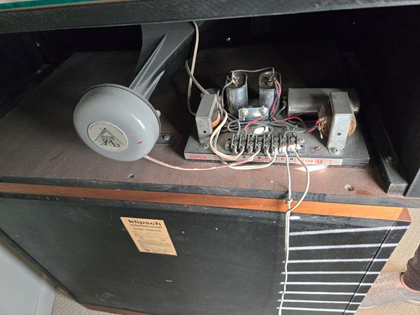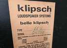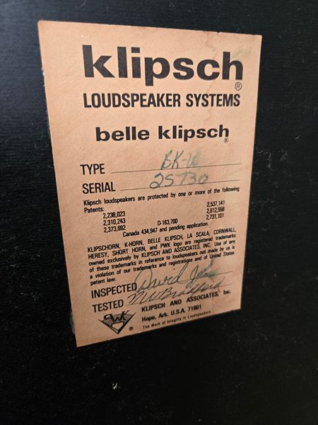 Matched pair of Klipsch Belle loudspeakers, manufactured in 1978, in excellent working condition for sale by the original owner's family. These are classic, fully horn-loaded speakers from Klipsch’s Heritage line, prized for their efficiency, dynamics, and lifelike sound. Even better—this pair includes original documentation, which is increasingly rare: Original sales receipt (Home Entertainment, Houston TX – dated 8/30/1978) Original Klipsch owner’s manual Original Klipsch warranty card Factory serial labels intact on both cabinets These speakers have been well cared for and sound fantastic. The Belle Klipsch sits between the La Scala and Klipschorn and delivers extremely high efficiency (can be driven with very low-power tube amps) Incredible dynamics and clarity Legendary Klipsch Heritage sound With original documentation and matching serials, this pair is ideal for a collector, audiophile, or serious vintage system. --- Details Model: Klipsch Belle Year: 1978 Impedance: 8 ohm Design: Fully horn-loaded, 3-way Crossover Points: 400 Hz & 6000 Hz Crossover Network: Type AA Serial Numbers: BK-WO #25730; BK-WO #25731 Finish: Walnut (BK-WO) Made in: Hope, Arkansas, USA --- Condition Function: 100% working, no issues Cabinets: Very good vintage condition with normal, age-appropriate cosmetic wear (see photos) Drivers & internals: Original and unmodified Grilles: Intact and present These have not been abused, altered, or “hot-rodded”—a big plus for collectors and purists. --- Logistics Due to size and weight, local pickup (El Lago, TX) is preferred but could arrange for delivery in the Woodlands I’m happy to demo them for serious buyers Cash or agreed secure payment only