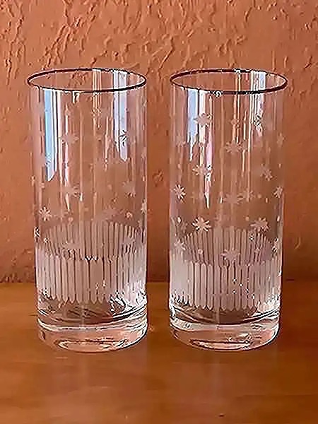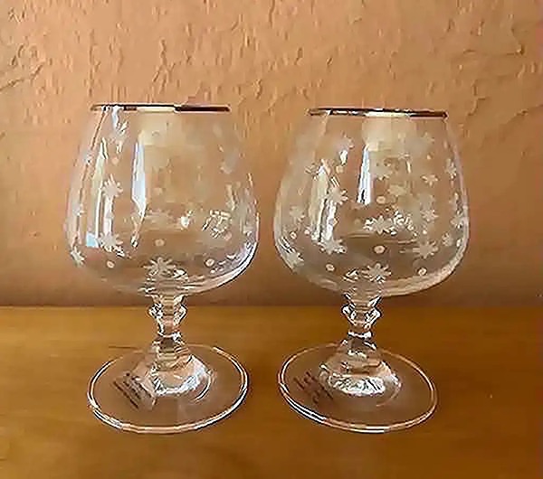 Mid century modern vibe! All are new, Etoile (starburst) etched glass with real platinum trim. Made in Slovakia. Two highball glasses (5.75”x 2 1/2”) and two brandy glasses (5” x 3 1/2”)…$40 total - willing to separate