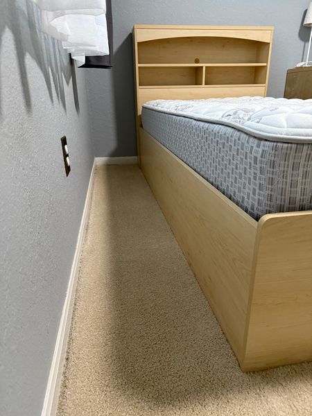 - Twin-size bed frame with 3 storage drawers and bookshelf headbord