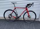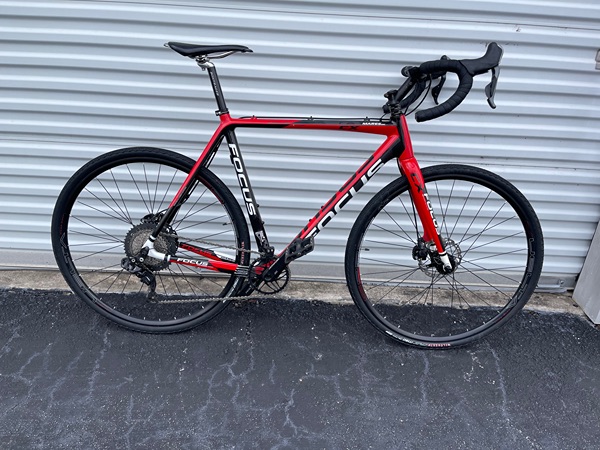 Focus Mares gravel bike for sale. Features include carbon fiber frame, Ultegra DI2 electric shifting, hydraulic disc brakes, 11x1 gears, Cannondale SI crank, ceramic-bearing bottom bracket, battery level/gear selected indicator, and carbon fiber seatpost. Size is 58cm. Tires are like new tubeless 700x36 Hutchinsons. It is in excellent condition.