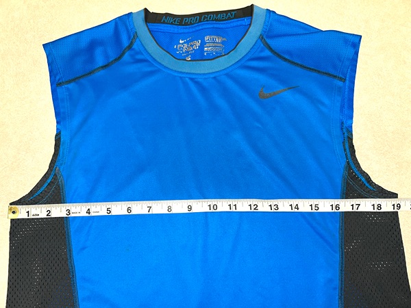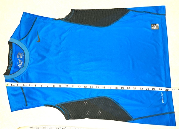 Nike men's medium sleeveless performance tank top featuring Dri-Fit technology and mesh panels for breathability. Item does show some wear, including cracks in the graphics (pictured) and a small snag near the front bottom (look above number 21 on the measuring tape). Overall, it's in good condition with no known tears, stains, or unsewn seams. Smoke free home. $4
