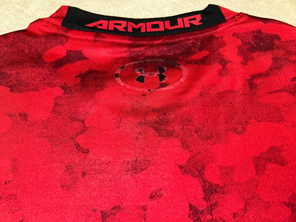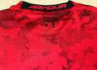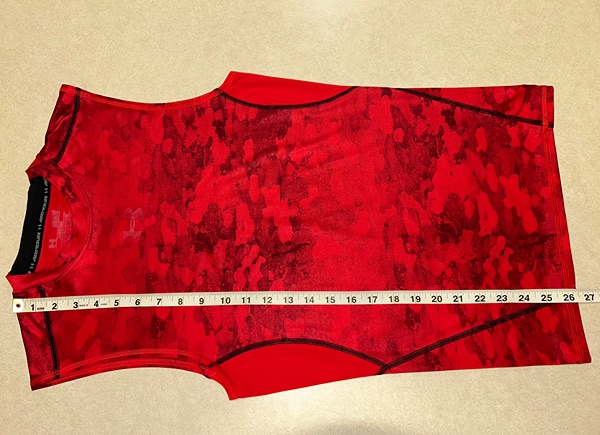 Under Armour men's red camo compression sleeveless tank top, size medium, snug fit. Structurally, the shirt is in very good condition with no known holes, tears, stains, odors, or unsewn seams. However, the black ink on the front logo and tag has come off, and it's about half gone on the back logo (all pictured). Smoke free home. $4