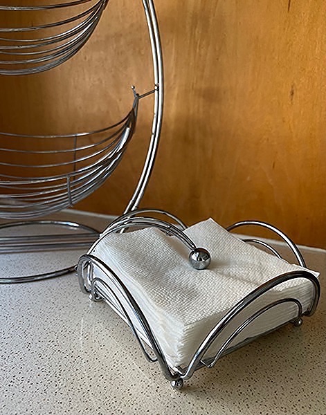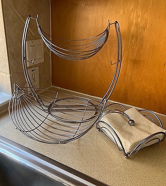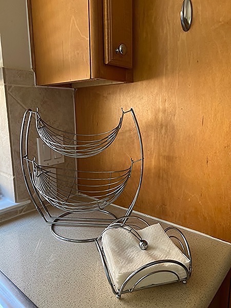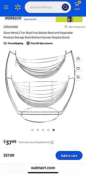 "Double design to artfully display your fresh produce. Chrome metal construction for durability and style. Provides unparalleled air circulation to your fruits and vegetables to keep them fresher longer"…$35 total, firm