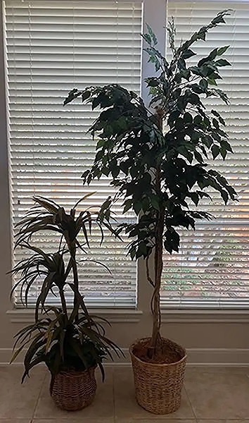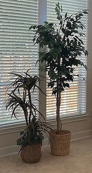 Two artificial trees plants in wicker baskets. Tallest one (7’+) has little bird in nest and the shorter one is about 4’ tall…$40 total, firm