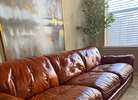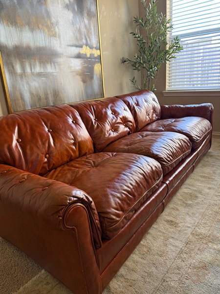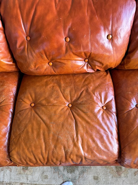 Gorgeous Mid Century Sofa from 1970’s. This is the “Drexel Heritage” Couch. High end, real leather. It does have tears and some areas are worn. Its old. The color is aged beautifully and it’s even prettier in person. There’s 1 button missing but I do have on hand. Couch is on the smaller side (sits low bc legs are 1inch) very sturdy & bones are great!