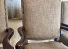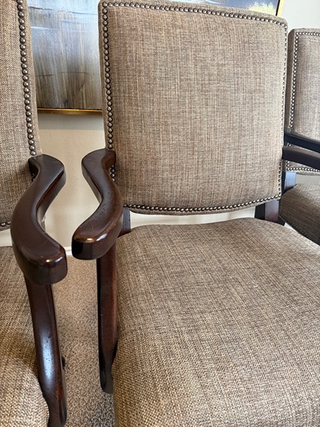 These beautiful Arm Chairs are custom. In the color “Tiara Brown” with a walnut finish and silver studded details. There’s no rips or stains. Caster wheels on all four chairs. In great condition.