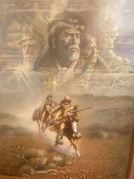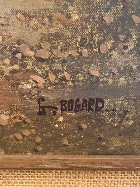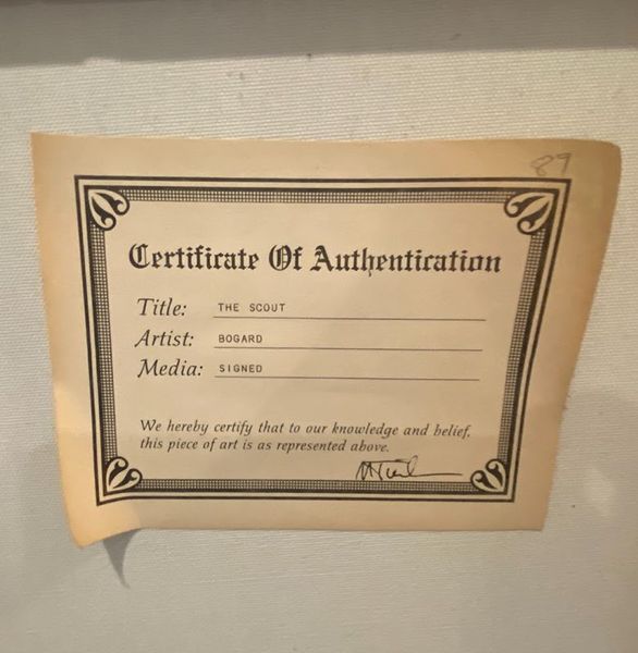Gerald Bogard was a 20th-century American artist known for Native American-themed works, including depictions of scouts and warriors. This signed painting is in excellent condition. 'The Scout' is a western themed painting that would go great in anyone's home that is looking for this certain decor. Measuring with the frame it is 42 x 31.