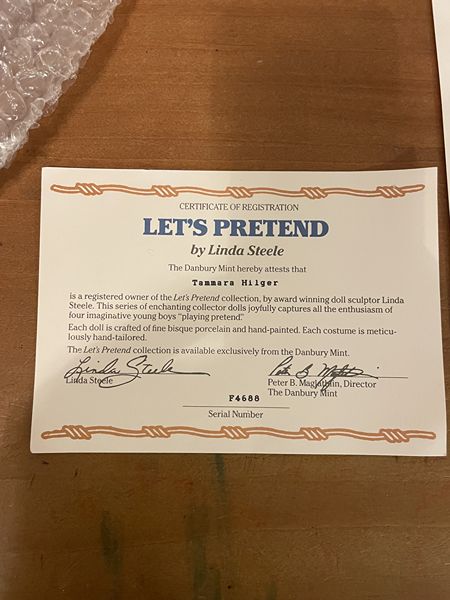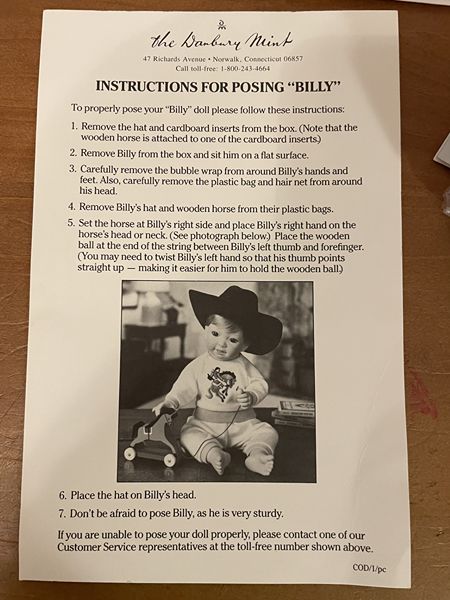 The Danbury Mint Billy the Cowboy Kid Linda Steele Lets Pretend Series porcelain doll by artist Elke Hutchens is a vintage collector's edition from 1992. This original boy doll features straight hair, light complexion, and blue eyes, making it a unique addition to any doll collection. The Danbury Mint brand and franchise add to the charm and authenticity of this classic piece, perfect for all occasions and adult collectors alike.